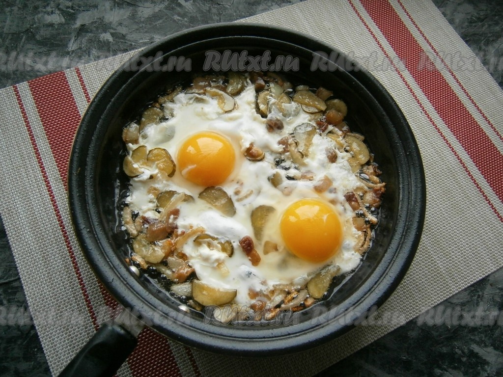 Далее разбить в сковороду 2 яйца, немного их посолить, прикрыть сковородку крышкой. Готовить яичницу с солёными огурцами и луком на медленном огне минуты 4 - пока не свернутся белки.