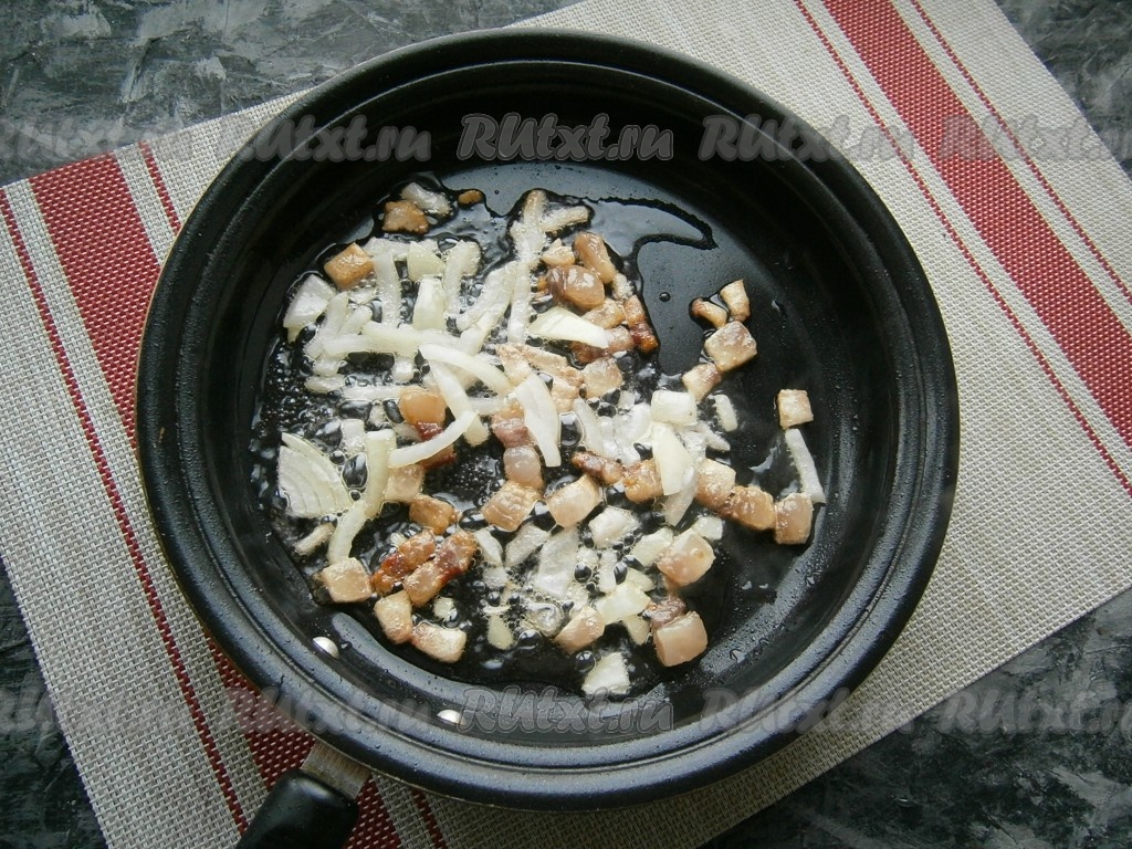 Поместить сковороду на огонь и обжарить сало до тех пор, пока из него не вытопится практически весь жир. Сало превратится в шкварки. Затем сало можно убрать, я оставляю. Добавить в сковороду очищенный и нарезанный произвольно репчатый лук, обжарить его на среднем огне до лёгкой золотистости, иногда перемешивая.