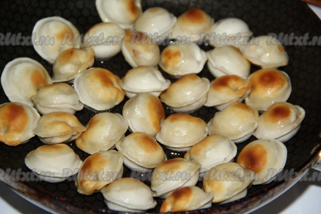 Обжарить пельмени с двух сторон до золотистой корочки на среднем огне (я обжаривала пельмени 7 минут), дать остыть.