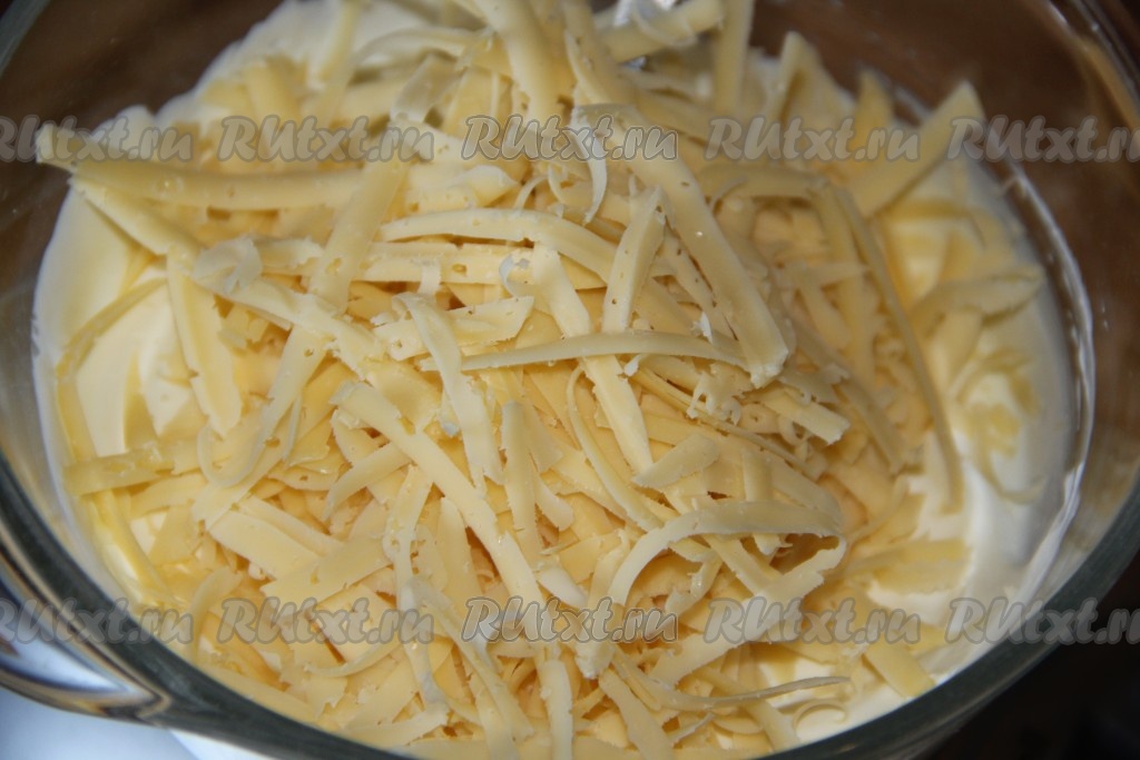 Сыр натереть на тёрке. Большую часть натёртого сыра добавить в смесь сметаны и майонеза, перемешать. Оставшийся сыр понадобится для посыпки пельмешек перед запеканием.