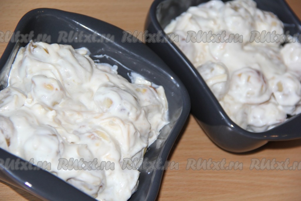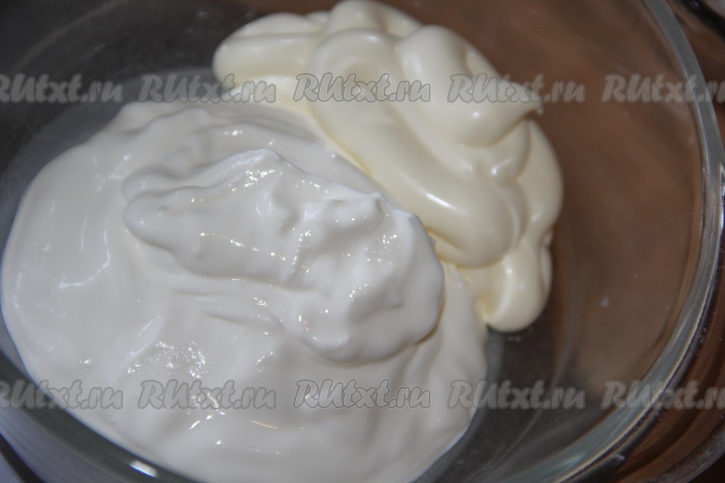 В отдельной ёмкости соединить сметану и майонез, добавить соль, перемешать.