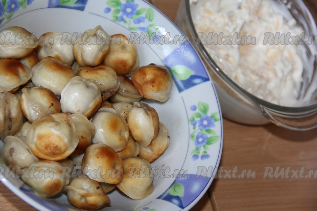 К остывшим пельменям выложить сырно-сметанную смесь.