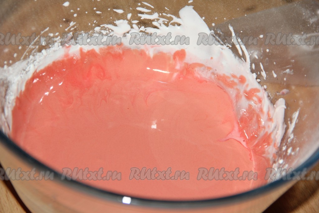 В пену из белка всыпать сахарную пудру и взбивать миксером минут 5. Далее влить лимонный сок и ещё раз взбить. Добавить гелевый краситель.