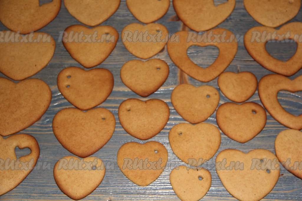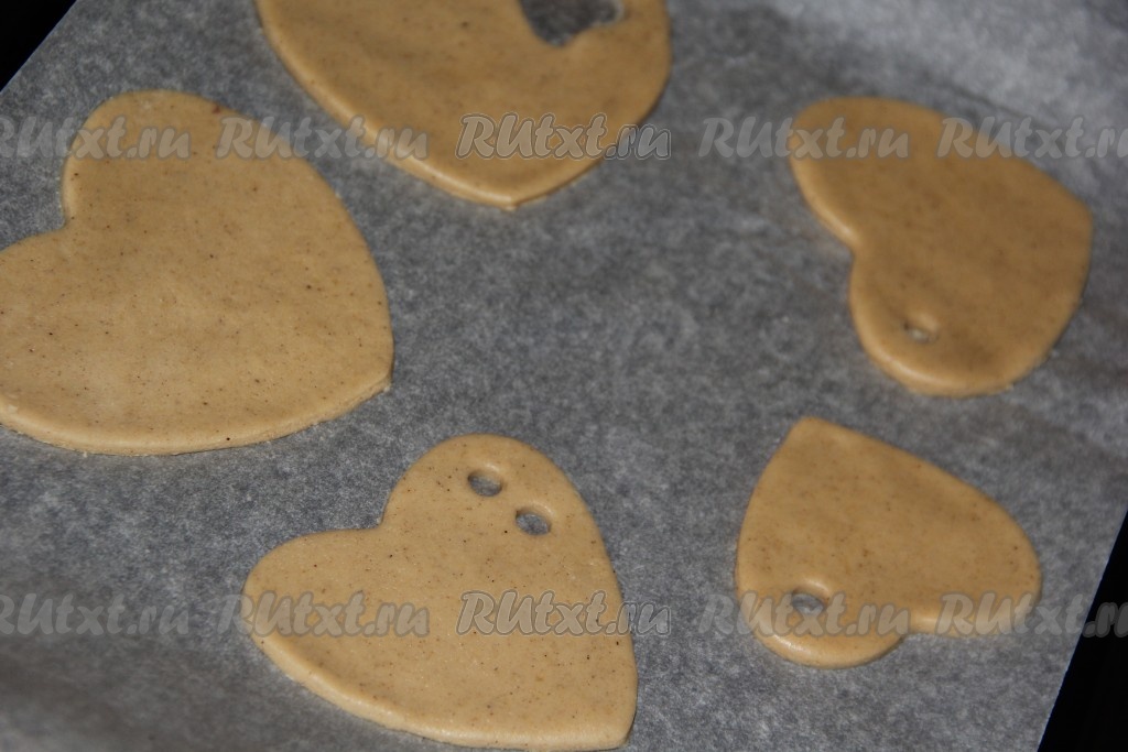 Выложить печенье на противень, застеленный бумагой для выпечки, на небольшом расстоянии друг от друга. В некоторых печенюшках я с помощью коктейльной трубочки сделала отверстия для ленточек.