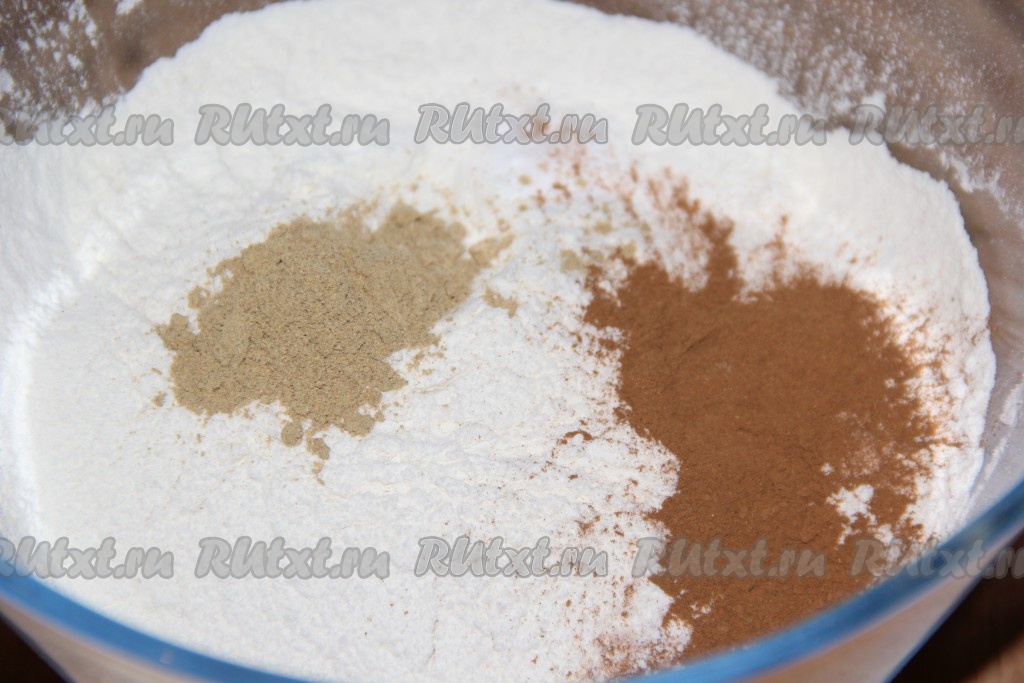 Соединить просеянную муку, корицу, имбирь, соду и соль, слегка перемешать сухие ингредиенты.
