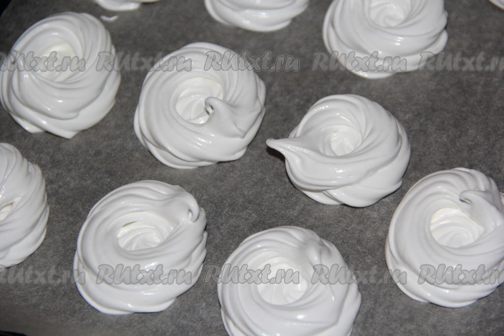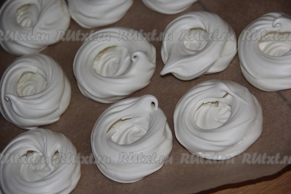 Противень застелить пергаментом и отсадить безе с помощью кулинарного мешка в виде гнёзд. Диаметр гнёзд, примерно, 8-9 см. У меня получилось 15 гнёзд.