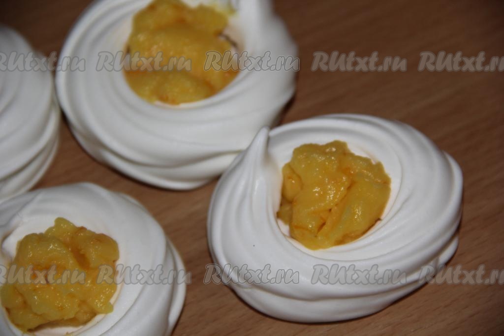 Наполнить гнёзда из безе любым кремом. Я использовала апельсиновый курд.