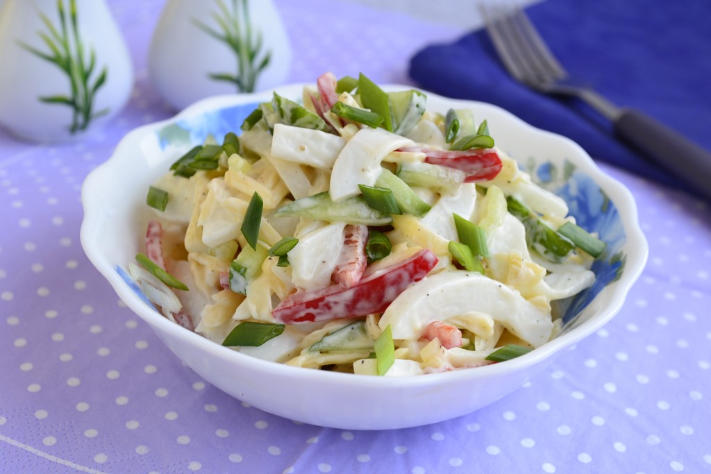 Очень вкусный, достаточно сытный салат, приготовленный с кальмарами, болгарским перцем, сыром и свежим огурцом выложить в салатник, посыпать измельчённым зелёным луком и подать к столу. Уверена, приготовив это аппетитное блюдо, вы ещё не раз будете включать его в своё повседневное и праздничное меню!