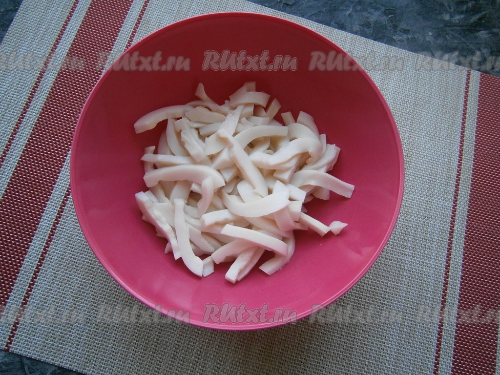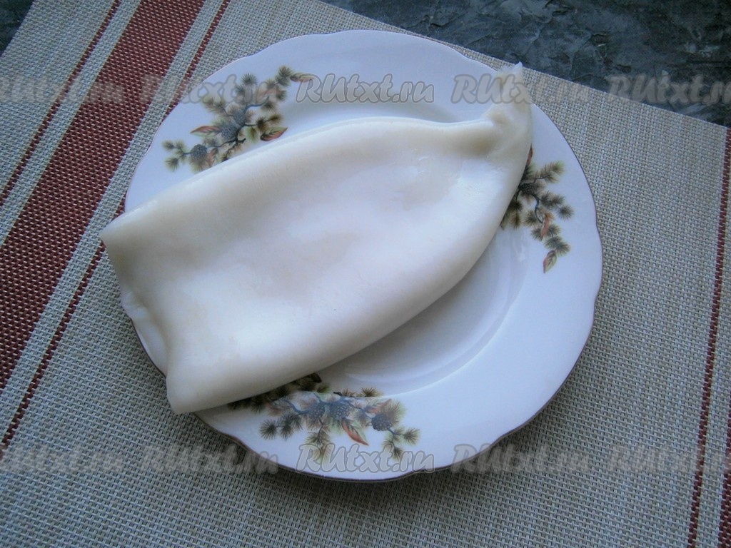 Тушку (тубу) кальмара разморозить, хорошо вымыть, удаляя внутренности и хорду.