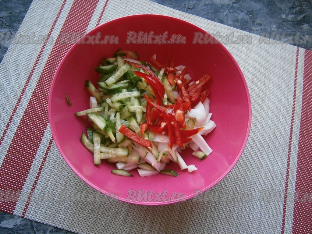Удалить из болгарского перца семена с плодоножкой. Для того чтобы салат выглядел более эффектно, я взяла перец красного цвета. Болгарский перец и свежий огурчик нарезать соломкой и добавить к нарезанным кальмарам.