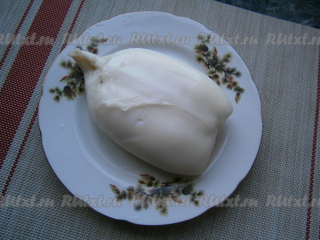 Поместить тушку в кастрюлю с холодной водой, поставить на огонь, воду посолить немного. Как только вода закипит, выключить газ, а кальмара вынуть и поместить в холодную воду. В этом случае мясо кальмара получится нежным и мягким. Когда кальмар остынет, нужно поддеть ножом и снять с его поверхности тонкую шкурку.