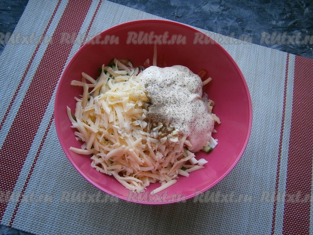В миску с салатом добавить майонез, по вкусу посолить и поперчить.