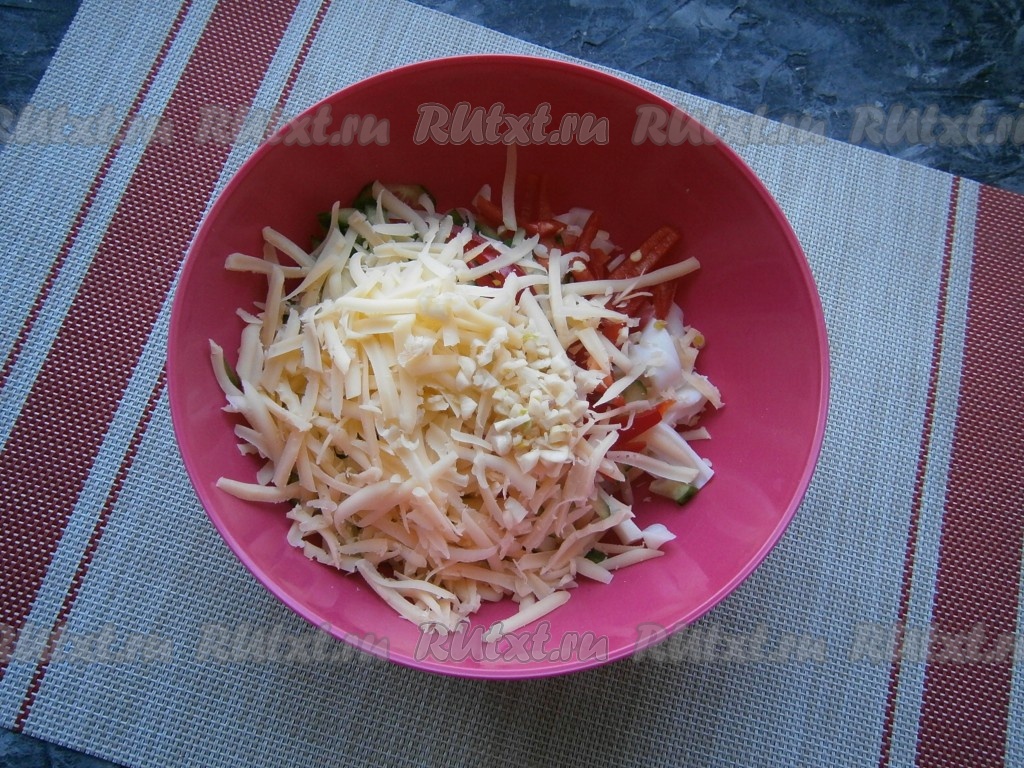 Сюда же добавить сыр, натёртый на крупной тёрке, а также мелко нарезанный (или пропущенный через пресс) чеснок.