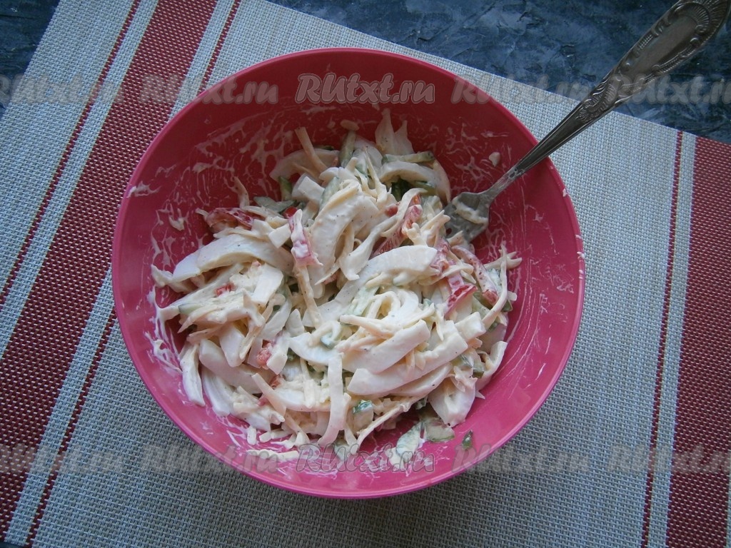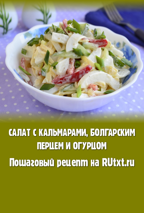 Предлагаю приготовить очень вкусный, аппетитный, достаточно сытный салат с кальмарами, болгарским перцем, свежим огурцом и сыром. Главное в этом блюде, конечно, правильно отварить тушку кальмара, чтобы она не стала резиновой и не испортила в итоге весь салат. Я заправила это блюдо майонезом, можно, конечно, в качестве заправки использовать сметану. Приготовьте аппетитный салат по этому рецепту и вы точно не разочаруетесь в его вкусе!