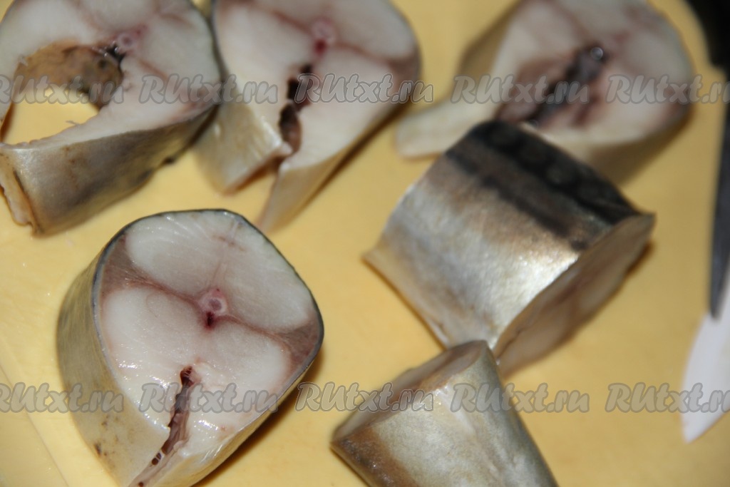 Разморозить скумбрию при комнатной температуре, затем отрезать хвосты, плавники и головы, удалить внутренности и хорошо промыть рыбу под проточной водой. Рыбку разрезать на кусочки. Я разрезала каждую скумбрию на 5 кусочков.