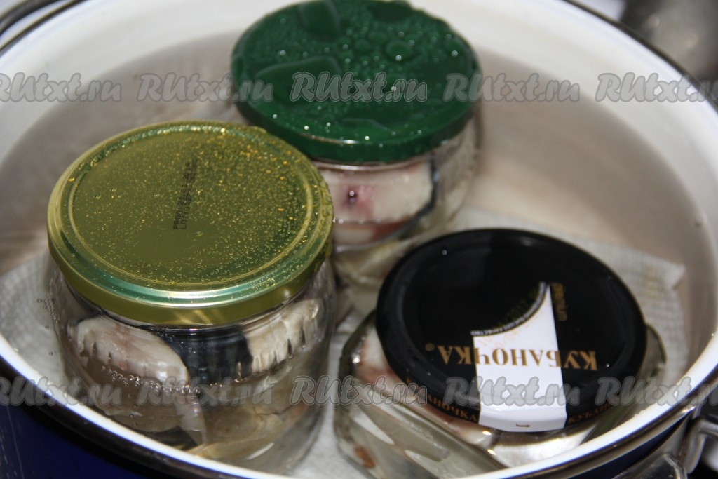 На дно кастрюли выложить хлопчатобумажное полотенце. В кастрюлю на полотенце поставить банки, влить воду по плечики баночек. Кастрюлю с банками с рыбой поставить на средний огонь.
