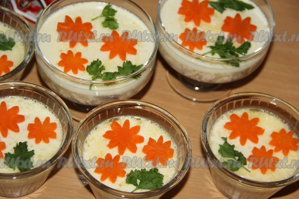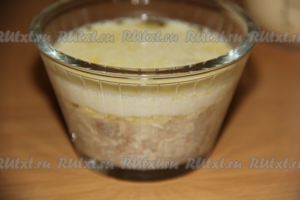 По прошествии 1 часа достать формы из холодильника и разлить майонезную массу по креманкам через ситечко. Получится полоска толщиной 1,5 см. Поставить формы в холодильник на час.