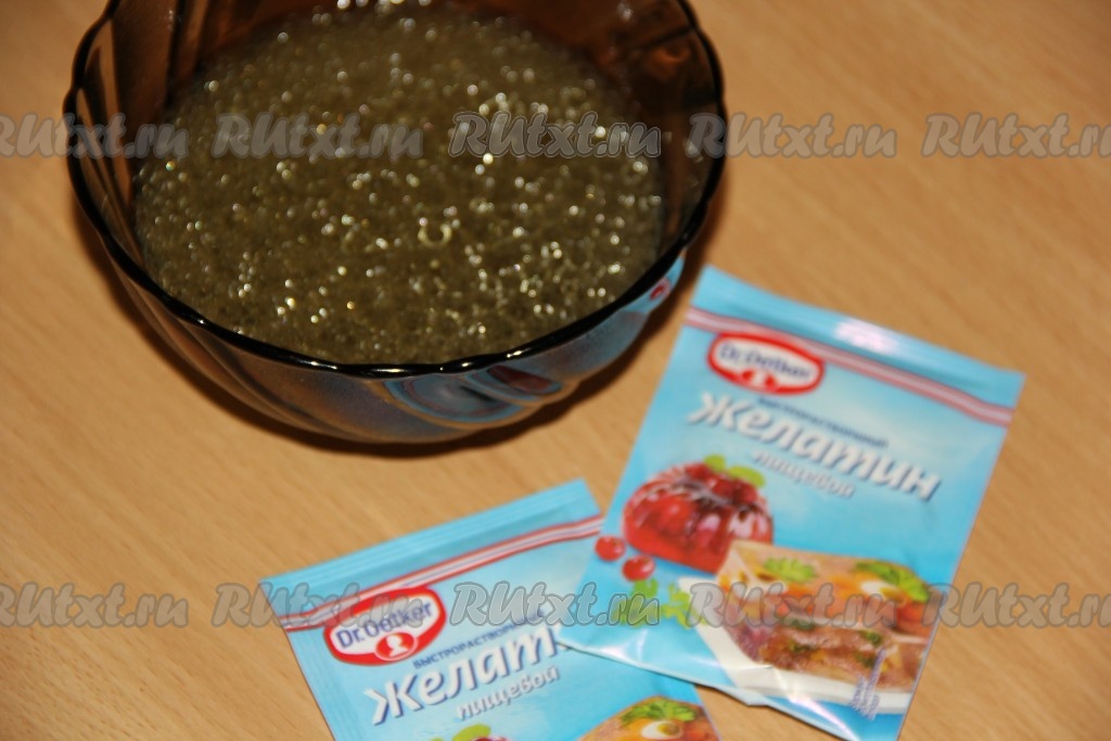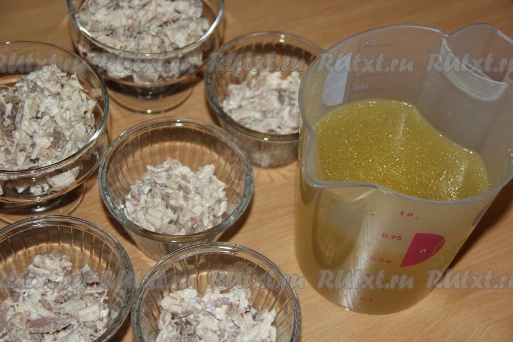 Разложить мясо по креманкам (или в одну форму). Прогреть желатин на среднем огне, помешивая, до полного растворения (не доводить до кипения!) и развести в 600 мл тёплого, предварительного процеженного бульона, посолить по вкусу.