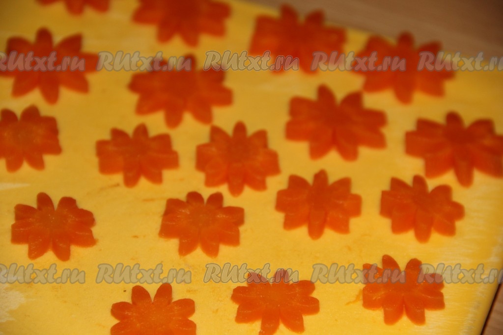 Варёную морковь из бульона нарезать на кусочки и вырезать из неё цветочки (или звёздочки).