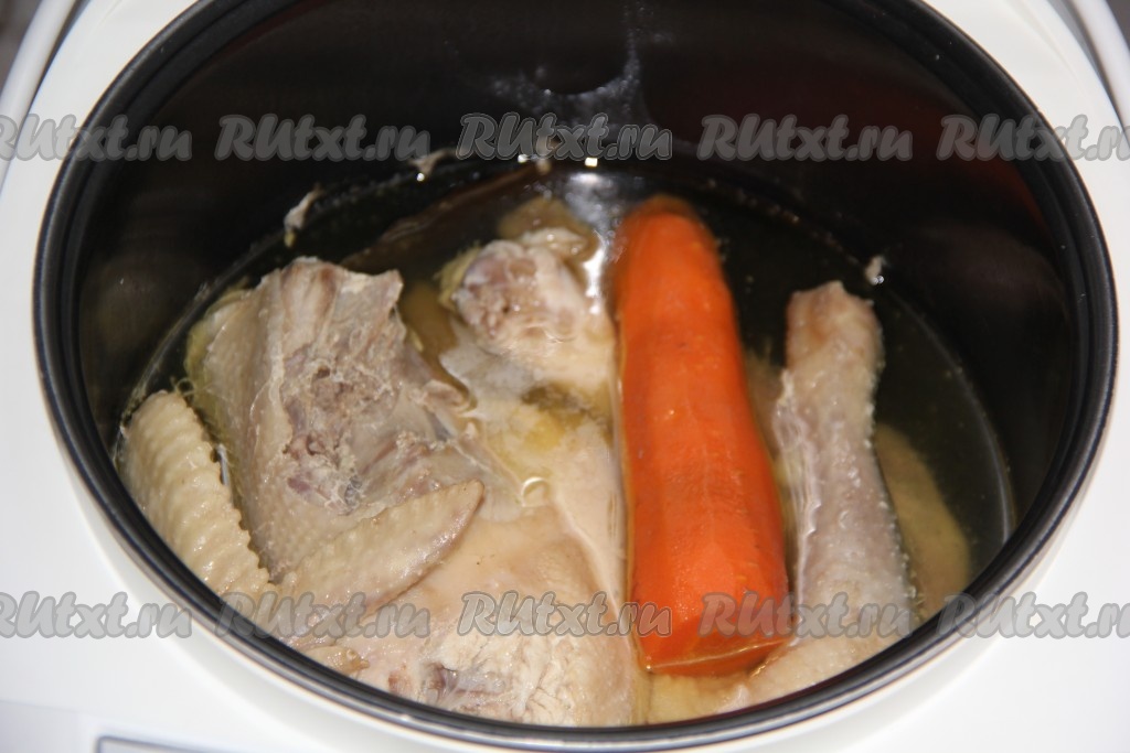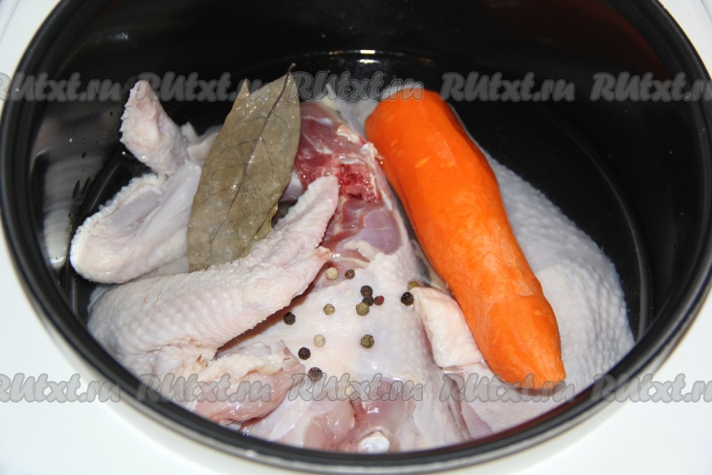 Я варила курицу в мультиварке (можно, конечно, варить и в кастрюле). Курицу вымыть, нарезать на крупные кусочки. Если готовите в мультиварке, тогда выложите нарезанную домашнюю курицу в чашу мультиварки, добавьте перец горошком, очищенную морковь и лавровый лист, залейте 1 литром воды и, закрыв крышку мультиварки, установите на 2 часа режим "Тушение" (если готовите обычную покупную курицу, то достаточно будет 1 часа). Если готовите в кастрюле, тогда крупно нарезанную курицу выложите в кастрюлю, добавьте очищенную морковку, лавровый лист, горошинки перца и залейте 1,5 литрами воды, домашнюю курочку варите в течение 2 часов (на варку обычной покупной курицы достаточно будет 1 часа).