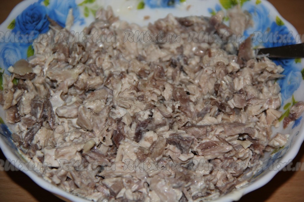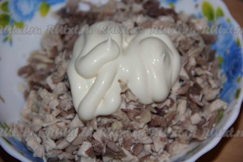 К мелко нарезанному мясу добавить 2 столовые ложки майонеза.
