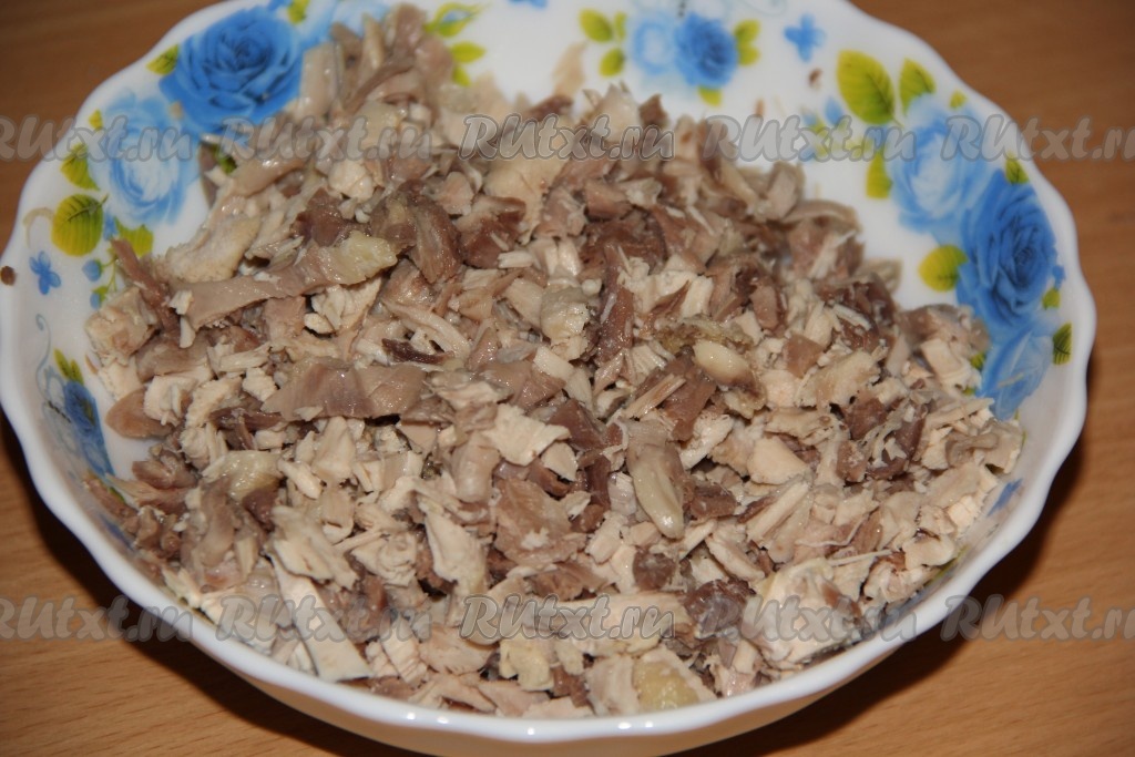 Мясо курицы отделить от костей и шкуры. У меня получилось 300 грамм мяса. Куриное мясо нужно мелко нарезать.