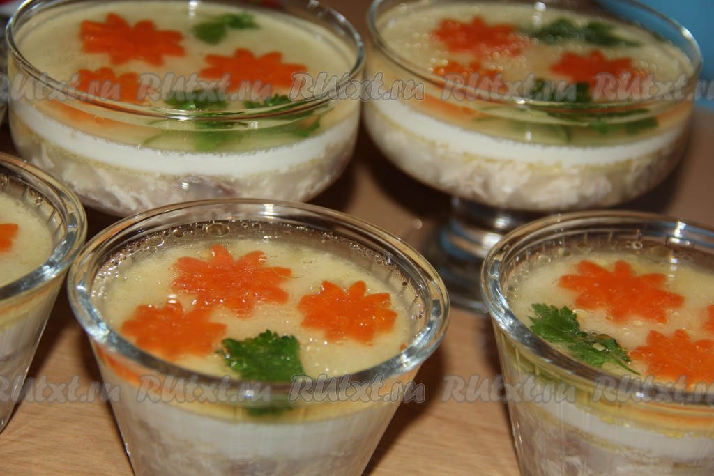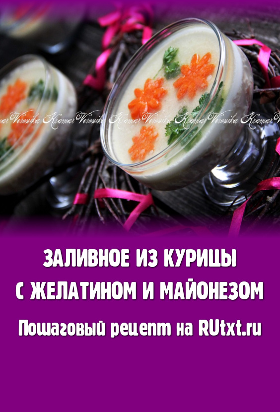 Рецепт заливного из курицы с желатином и майонезом я взяла в кулинарном журнале. Вкус блюда получился очень нежным, с приятной молочной ноткой. Сделала в порционных формочках: и подача выглядит красиво, и вид заливного очень презентабельный. Это красивое, нежное и вкусное блюдо станет украшением любого праздничного стола, всем советую этот рецепт!