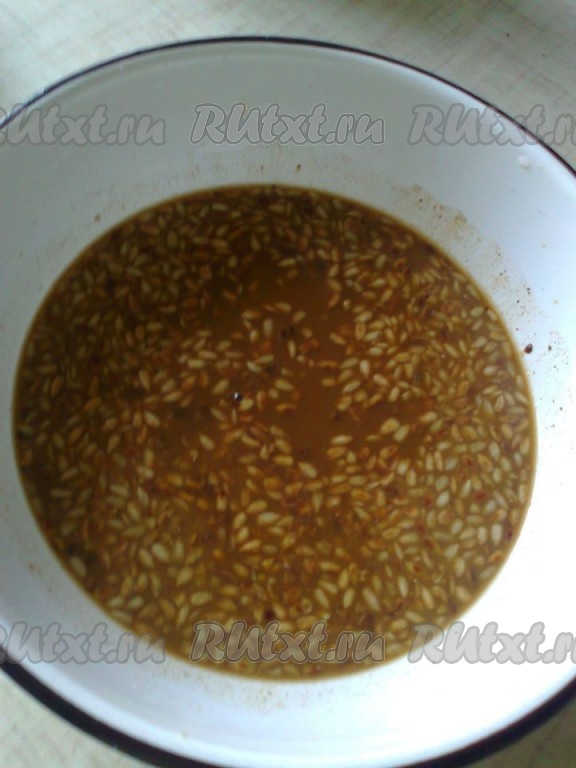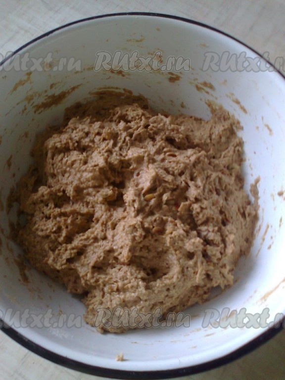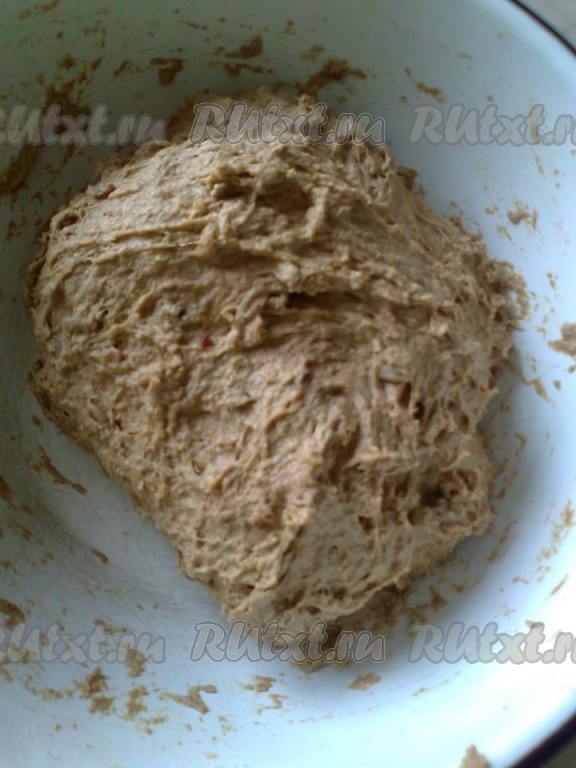 Когда закваска поднялась, смешайте в миске 200 грамм приготовленной закваски, 250-270 миллилитров тёплой воды, семечки, мёд, всю заварку из солода,