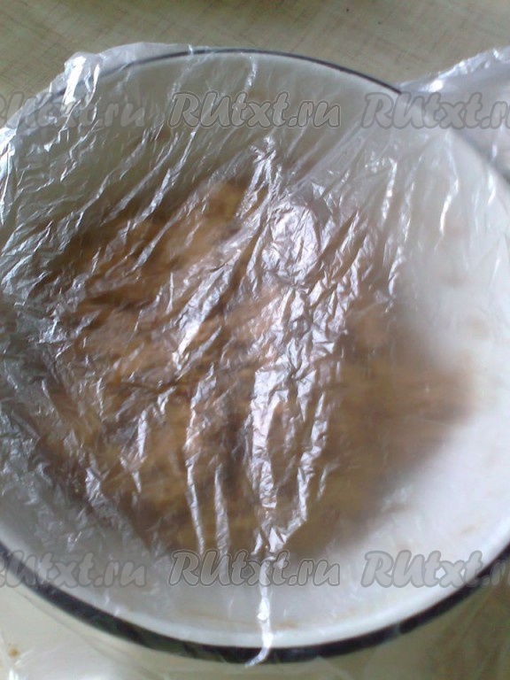 накройте миску плёнкой (или кульком) и оставьте на 30 минут для развития клейковины.