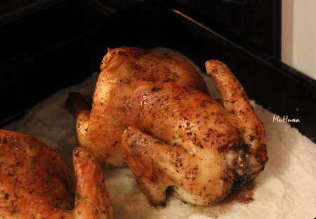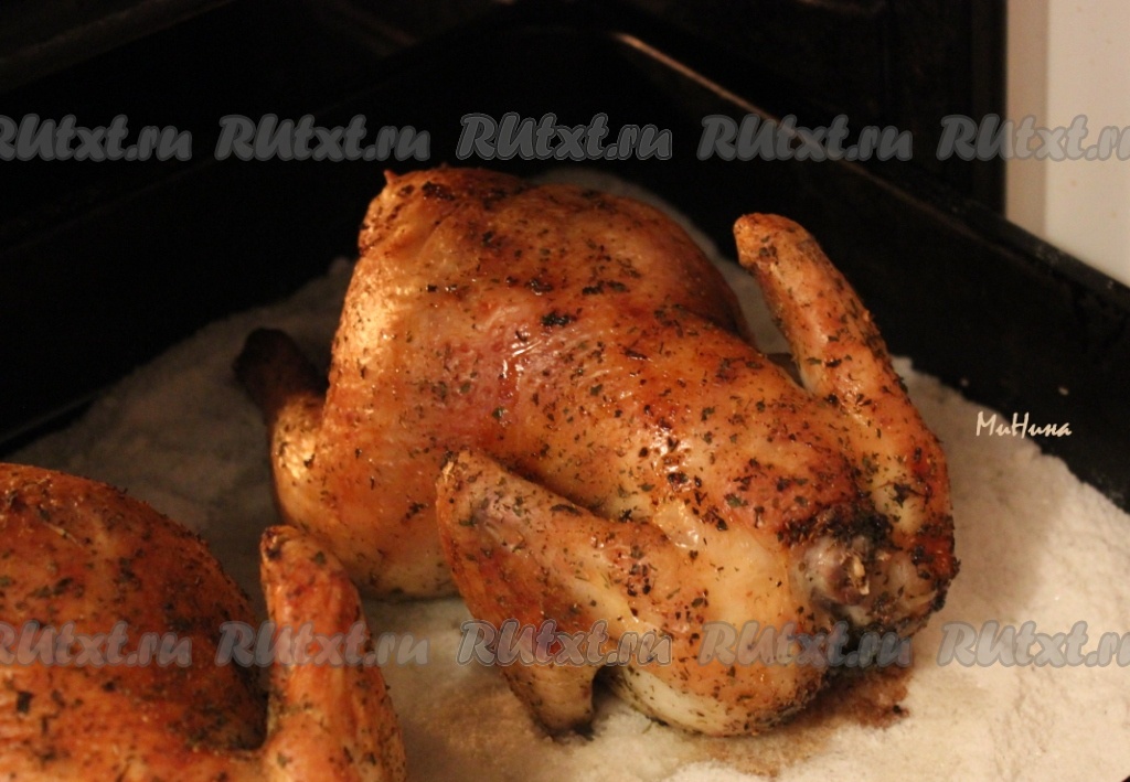 Курица, запечённая целиком на соли на противне в духовке, получается в меру солёной, румяной, сочной и вкусной.