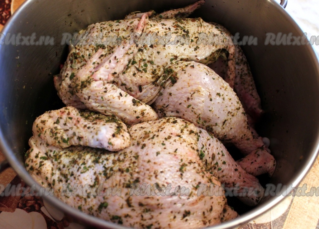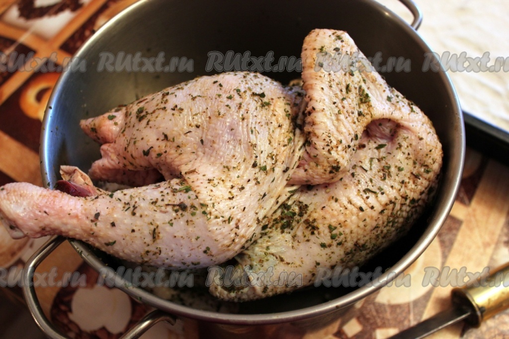 Курицу натереть прованскими травами (или другими специями) и снаружи, и внутри и, желательно, оставить промариноваться в прохладном месте на 2-3 часа (можно оставить промариноваться и на более длительное время).