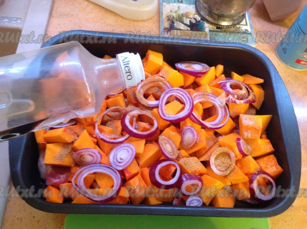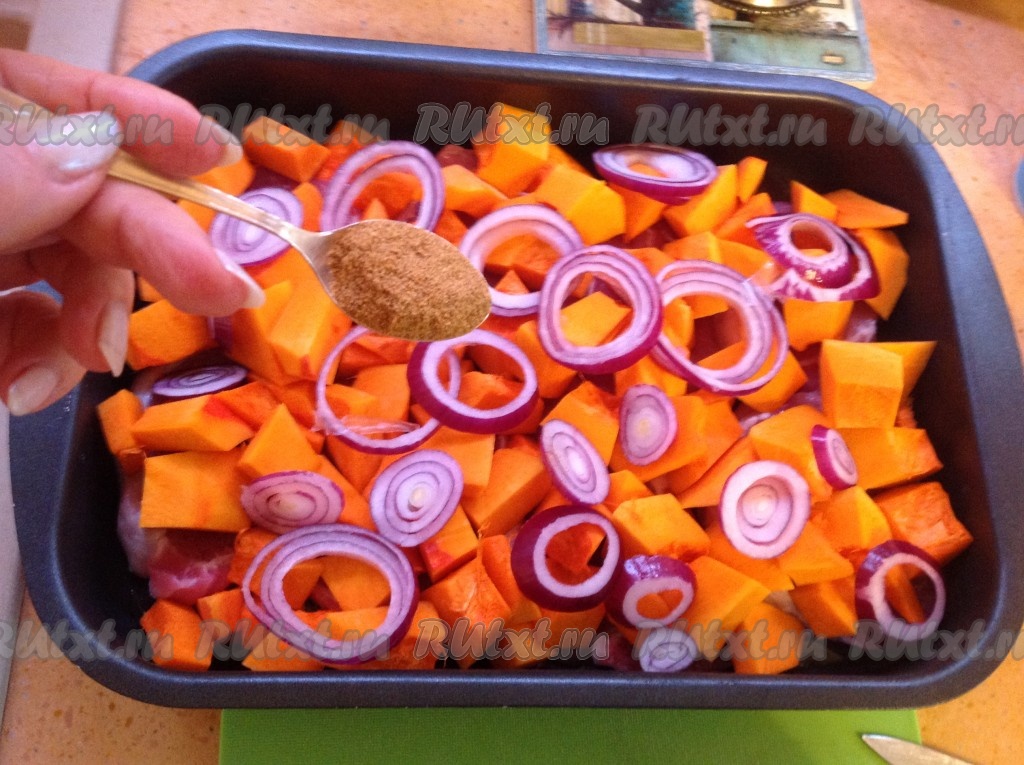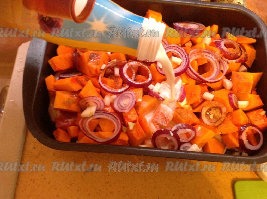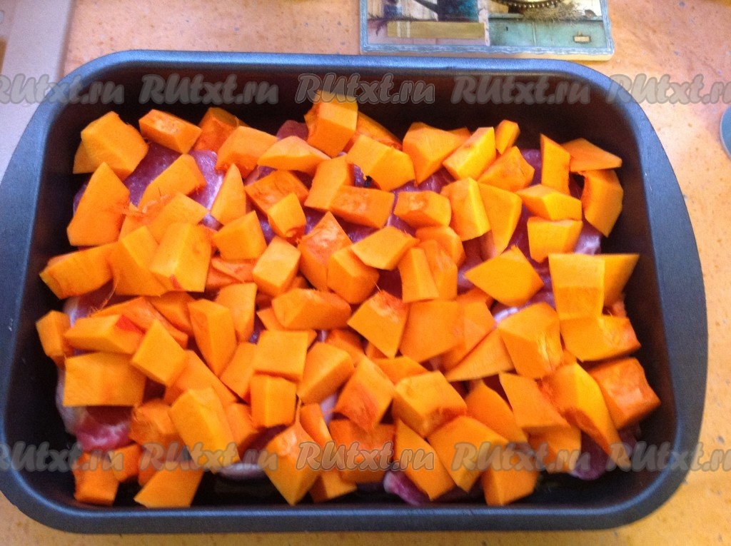 Выложить кубики тыквы поверх мяса.