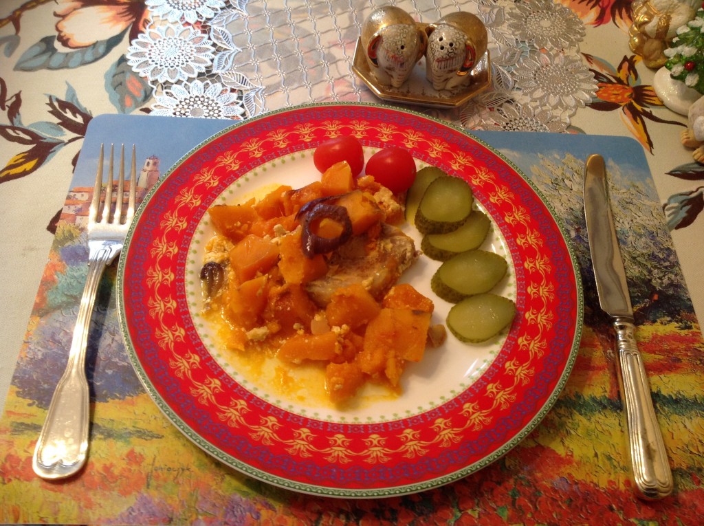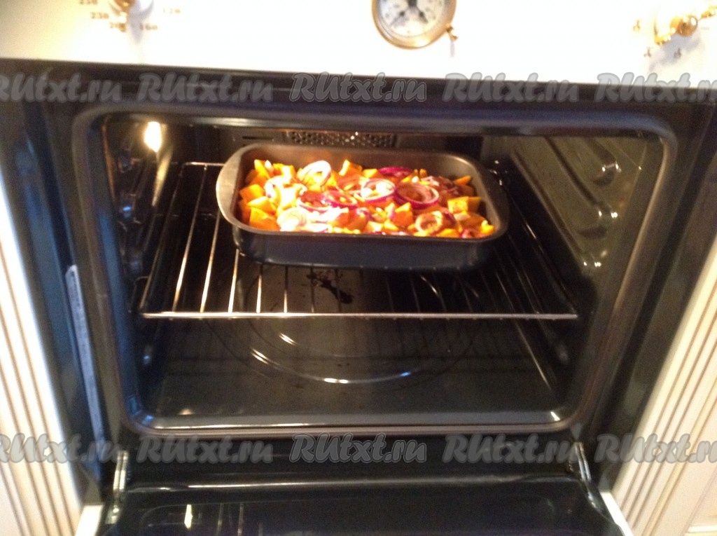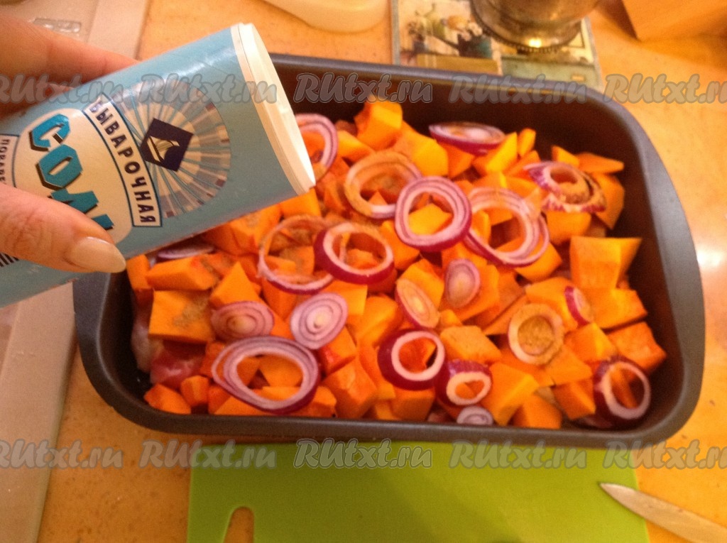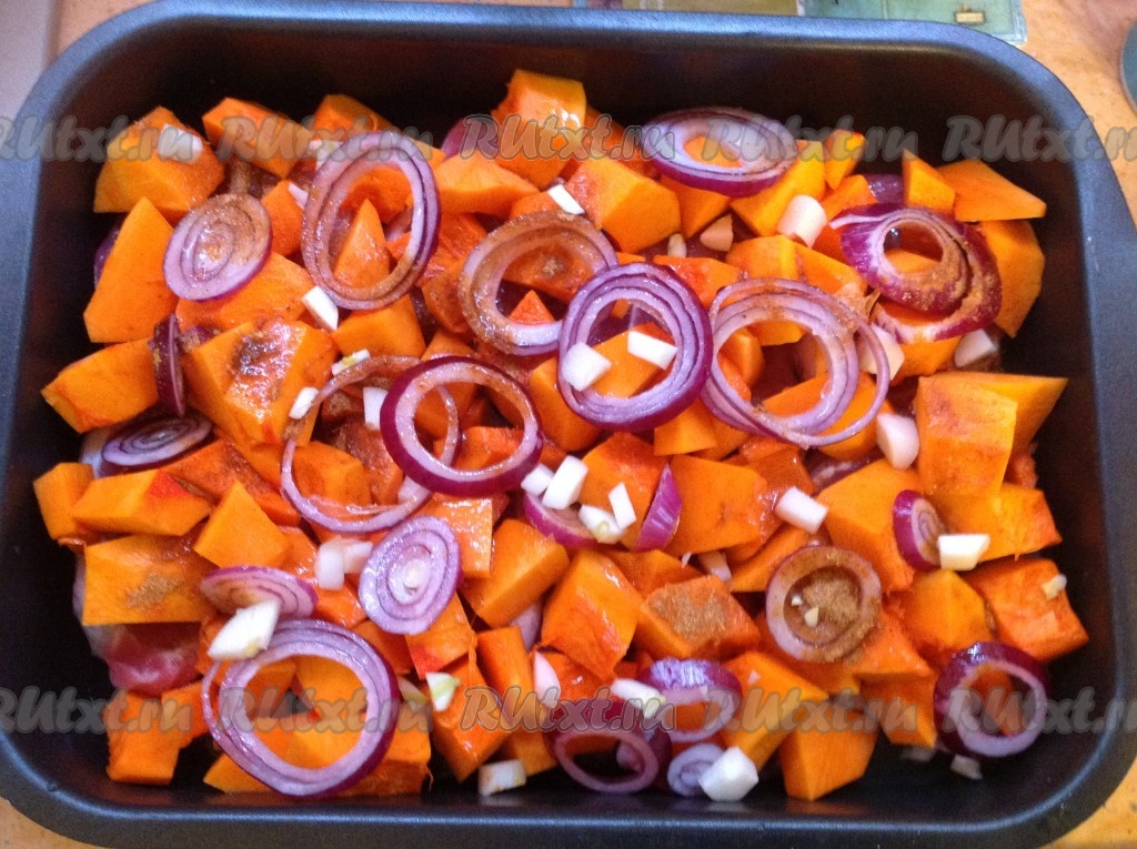 Выложить кубики тыквы поверх мяса.
