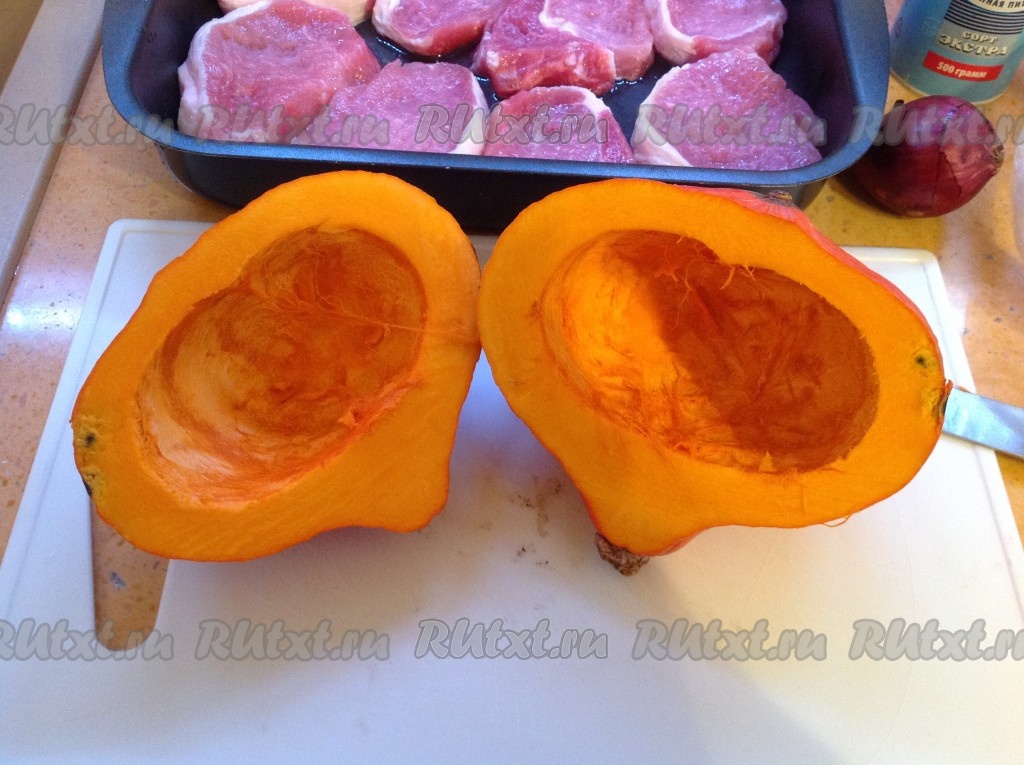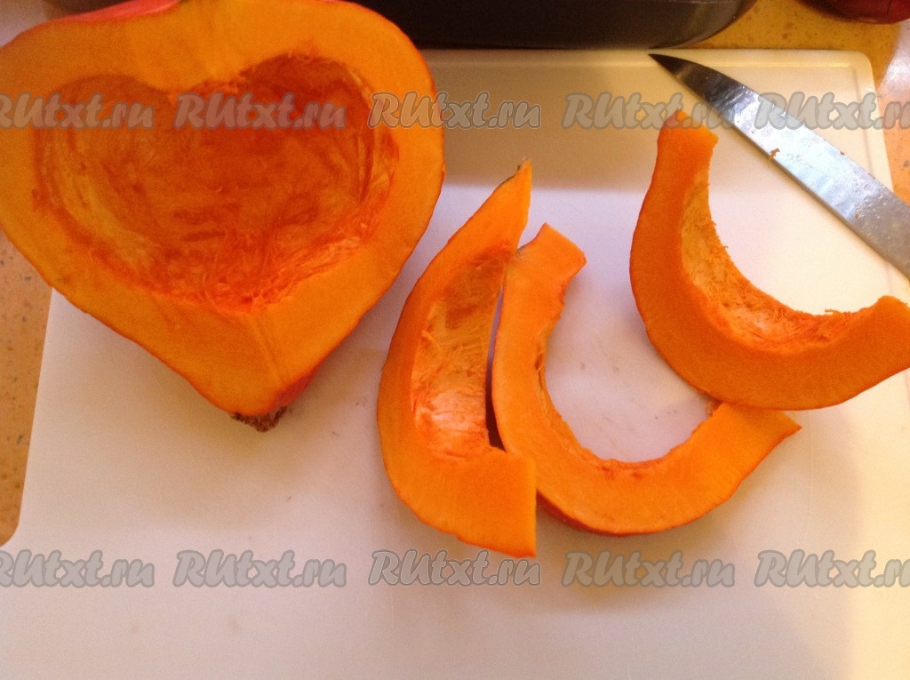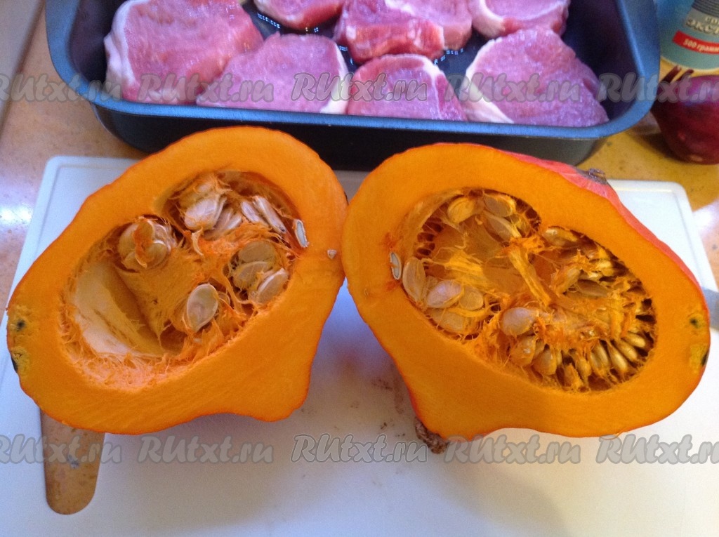 Тыкву вымыть, разрезать пополам, удалить косточки.
