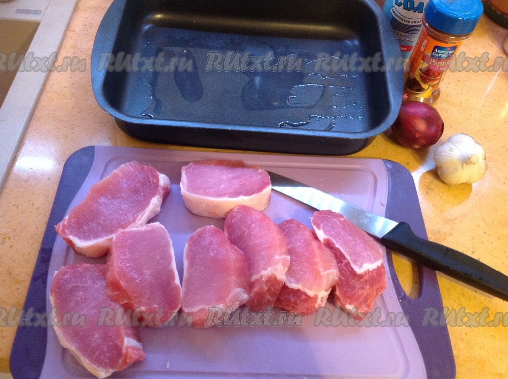 Подготовить корейку и противень, в котором будет запекаться наше блюдо. Корейку нарезать кусками толщиной 1 см.