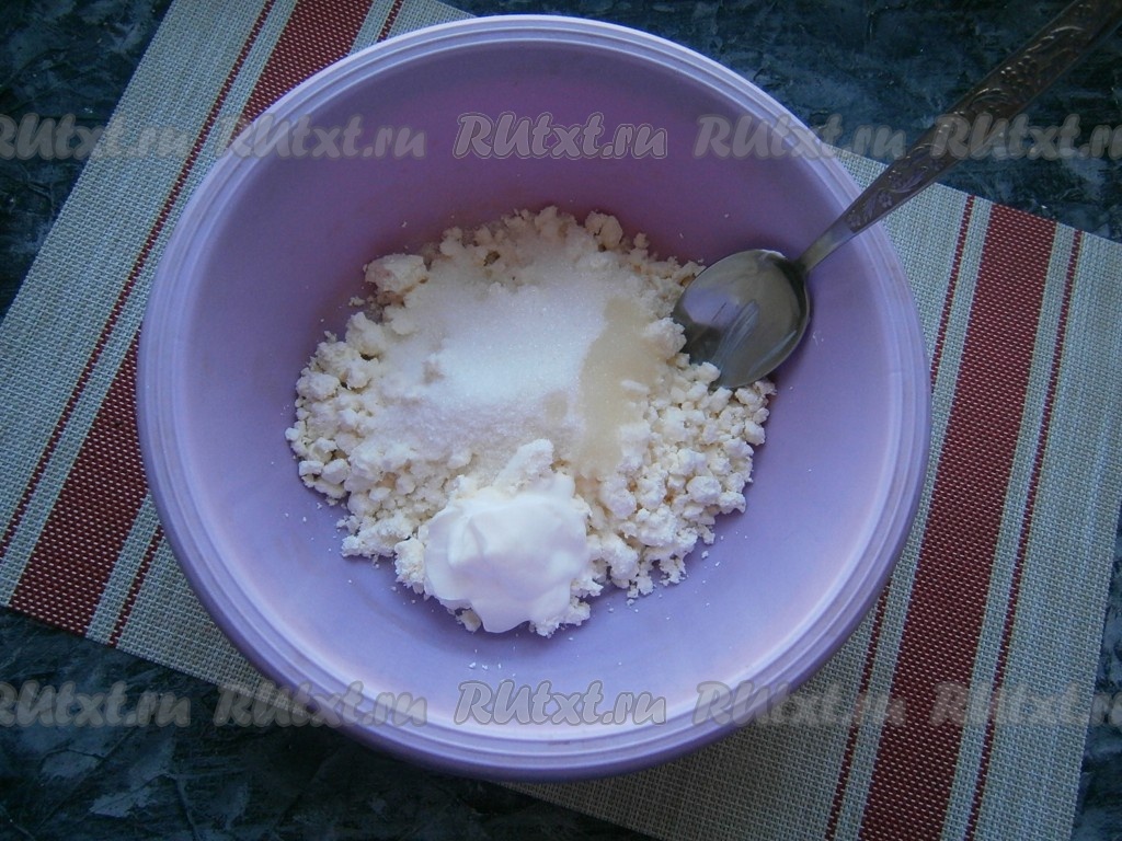 В творог добавить сметану, соль, растительное масло и 3 столовые ложки сахара.