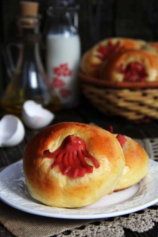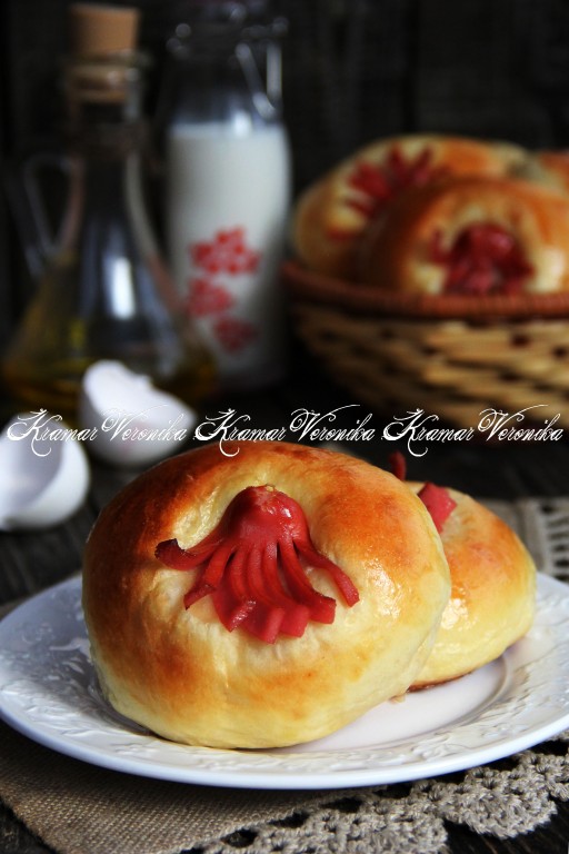 Недавно увидела в Интернете интересную идею, как оформить булочки с сосисками. Сразу взяла рецепт на вооружение, так как мои дети обожают выпечку с сосисками. Булочки из дрожжевого теста, испечённые в духовке, получились очень мягкими и пышными, а "осьминожки" из сосисок прекрасно украшают и дополняют их.