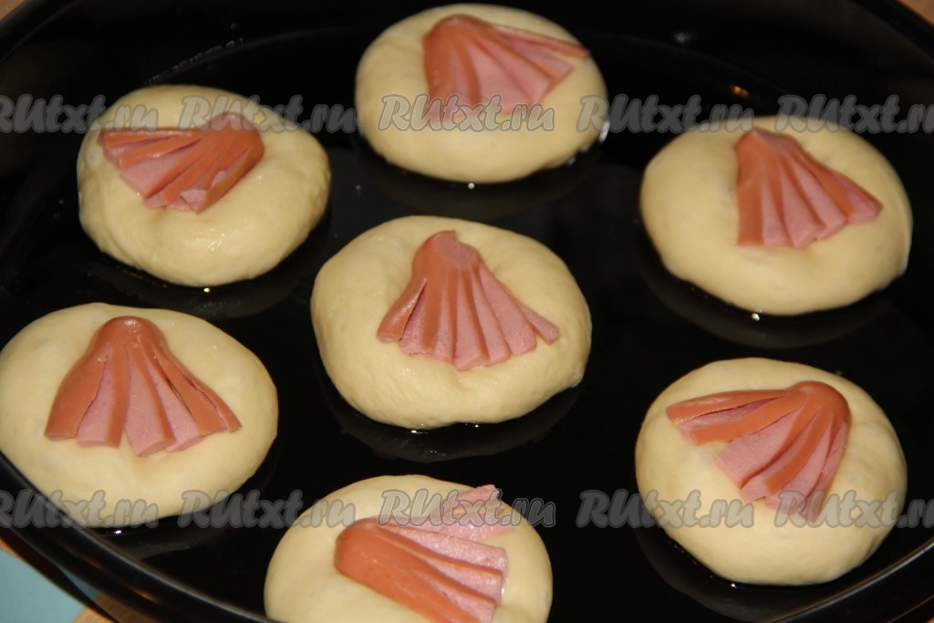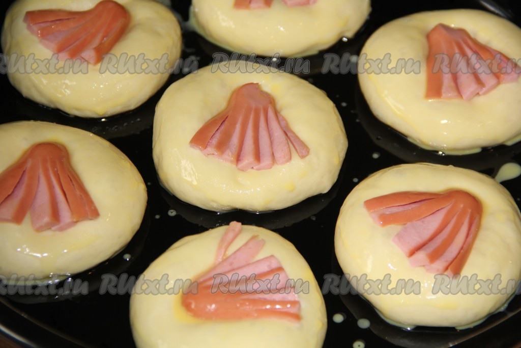 Поставить противень с дрожжевыми булочками с сосисками в разогретую духовку и выпекать минут 25 (тесто должно стать золотистого цвета) при температуре 200 градусов.