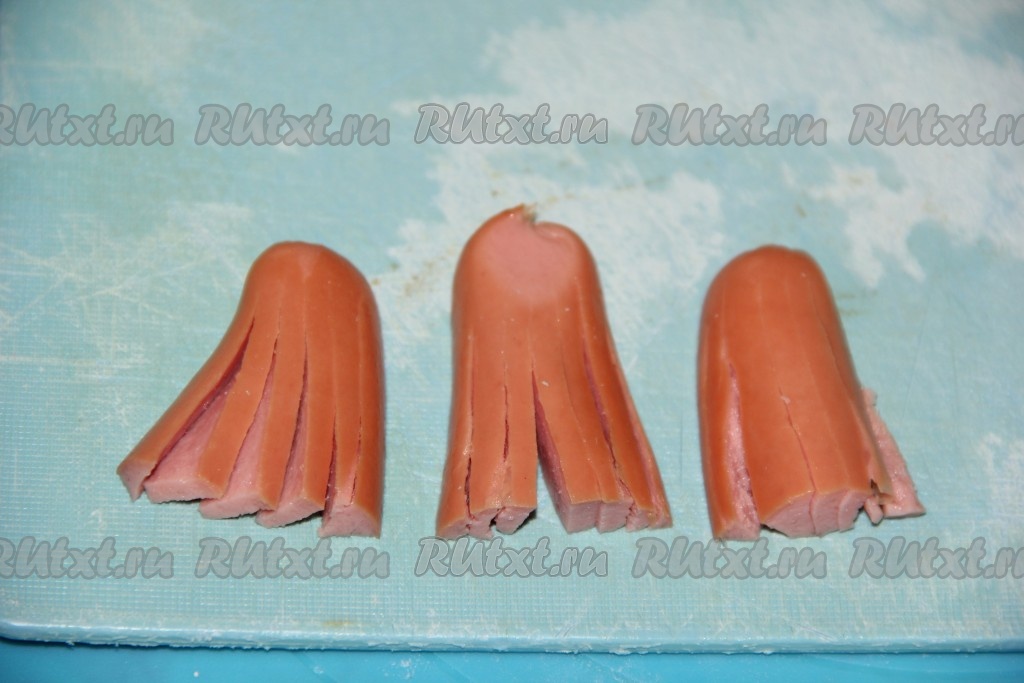 Каждую сосиску разрезать в длину на 2 части (я использовала "детские" сосиски, они чуть меньше обычных сосисок). Затем каждую половинку разрезать по горизонтали на две части (то есть каждая сосиска будет разрезана на 4 части). Каждую получившуюся часть сосиски разрезать, не дорезая до конца, на тонкие полосочки (как на фото) - у нас как бы получатся ножки осьминога.