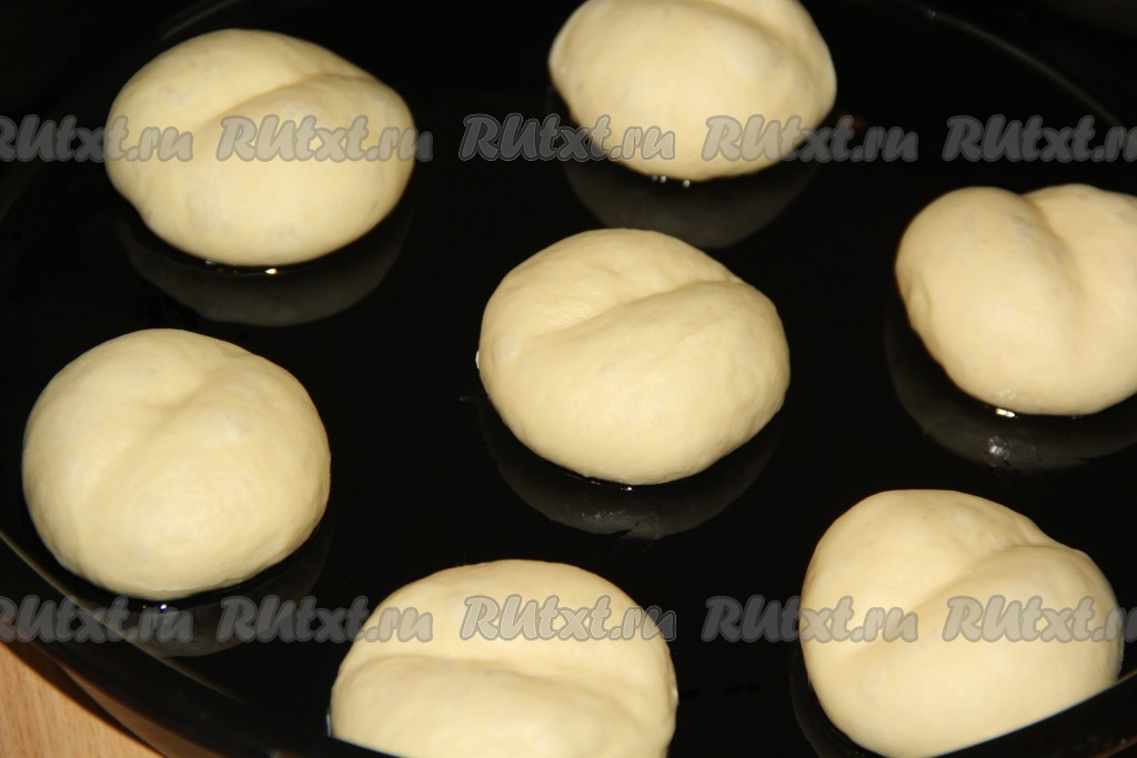 Выложить круглые булочки на расстоянии друг от друга на противень, смазанный растительным маслом, и оставить на 30-40 минут. За это время булочки увеличатся в объёме. Краем ладони на поверхности каждой булочки сделать по середине борозду (как на фото).