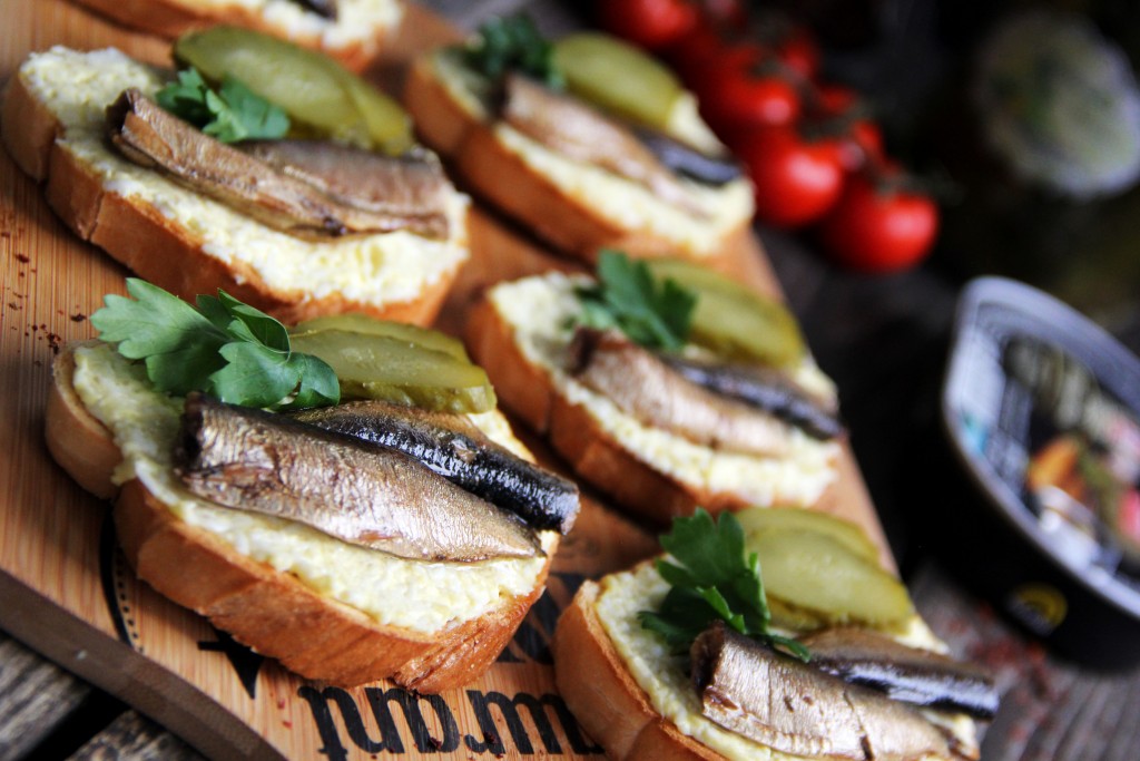 Вкусные, аппетитные бутерброды, приготовленные со шпротами и солёным огурцом, украсив веточкой зелени, подать к столу. Эта простая закуска станет прекрасным дополнением и к праздничному, и к повседневному столу.