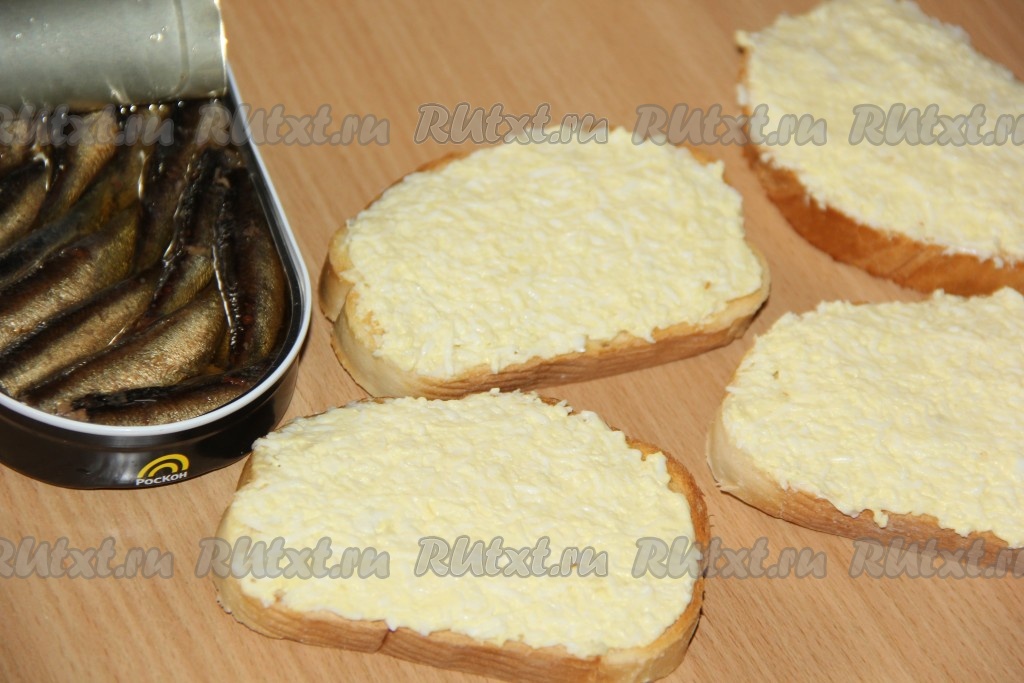 Кусочки батона подсушить с двух сторон на сухой сковороде (или в тостере).