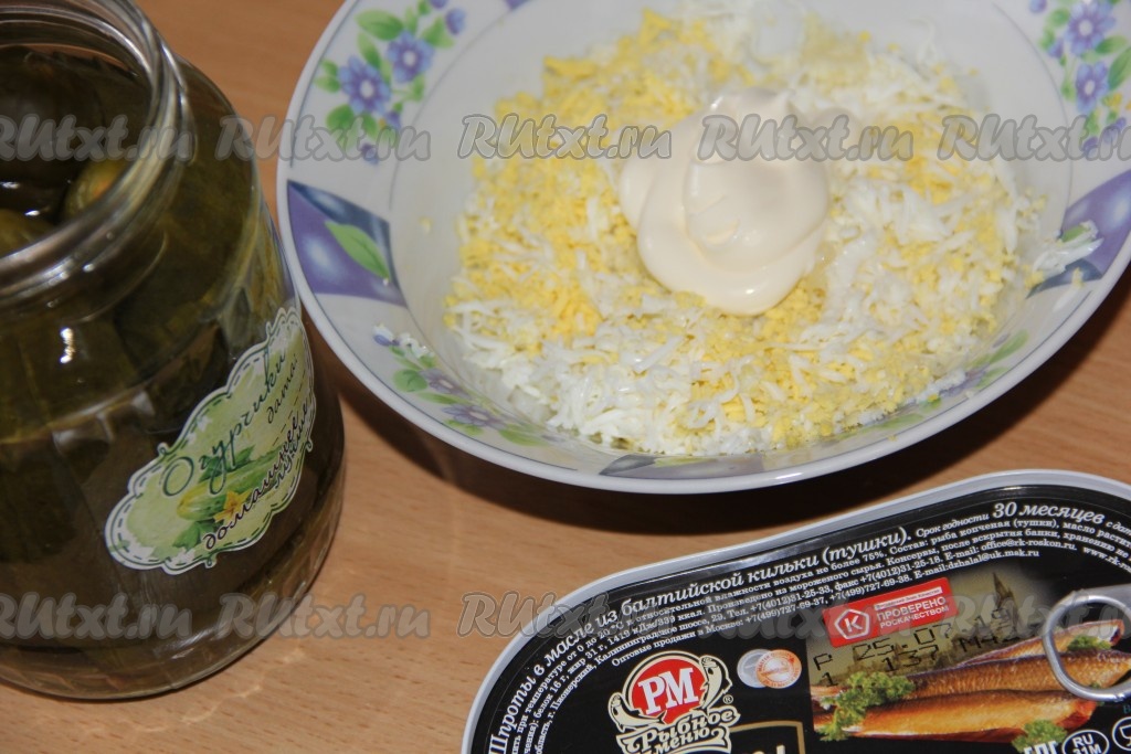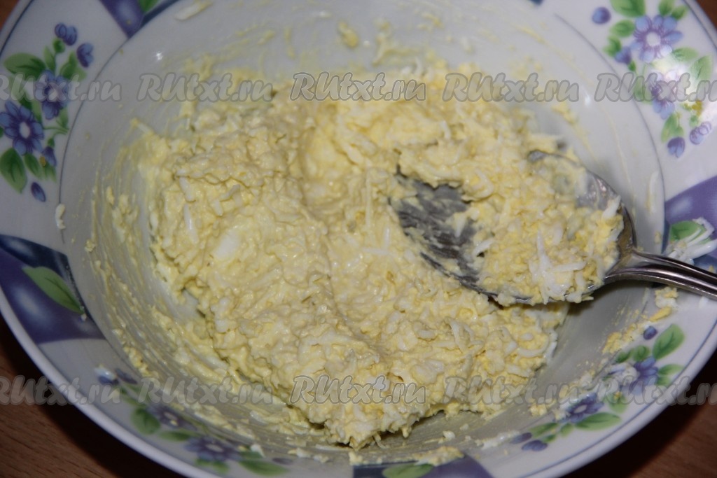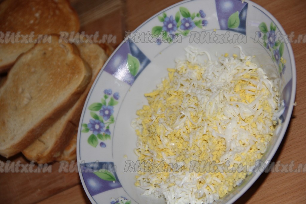 Яйца предварительно сварить вкрутую (на это понадобится минут 10 с начала закипания воды), очистить после остывания, а затем натереть на мелкой тёрке. Твёрдый сыр тоже натереть на мелкой тёрке и выложить к натёртым яйцам.