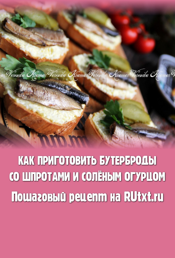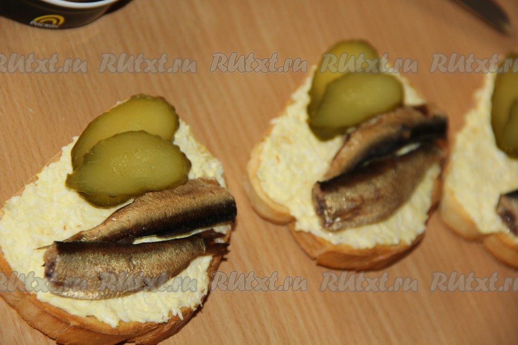 Солёный огурец нарезать тонкими ломтиками. Выложить по два кусочка солёного огурчика на бутерброд рядом со шпротами.