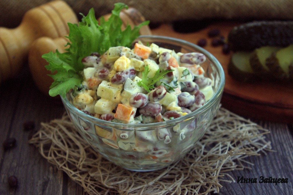 Приготовленный по этому рецепту салат из консервированной фасоли, яиц, моркови и солёных огурцов получился очень сытным и вкусным. Подавайте салатик порционно или в одном большом салатнике. Уверена, это блюдо понравится многим и внесёт разнообразие в повседневное меню!