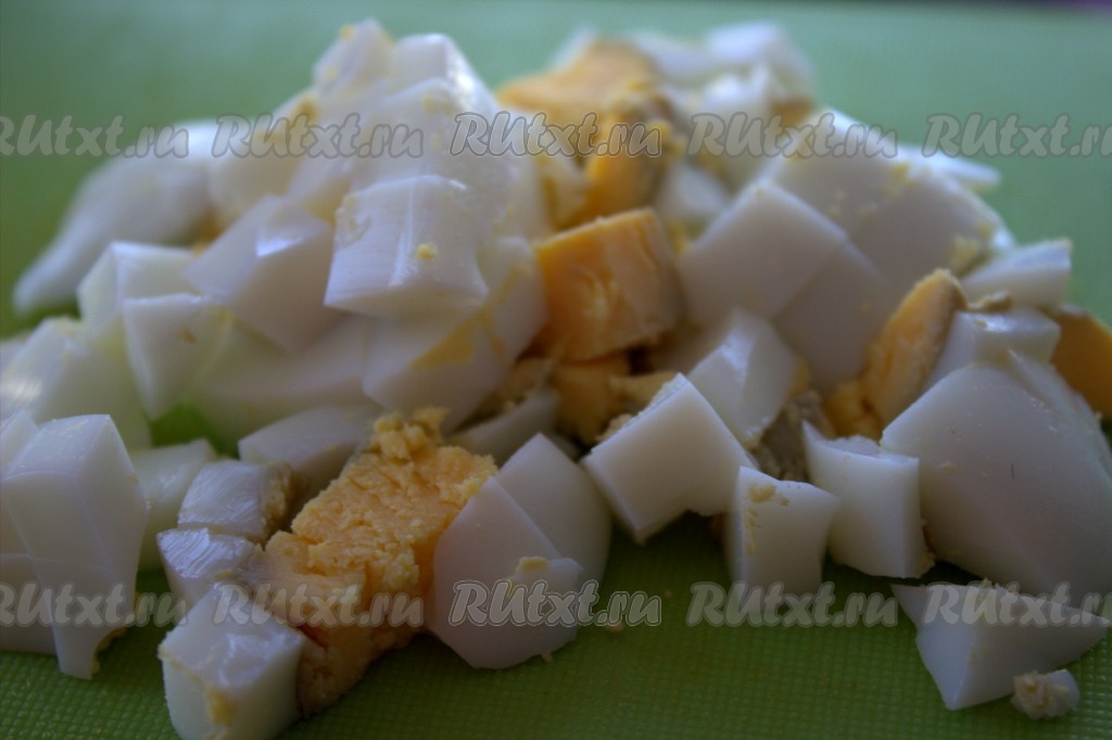 Отварить вкрутую 2 яйца (после закипания воды варить минут 10), затем охладить, очистить и нарезать на небольшие кубики.
