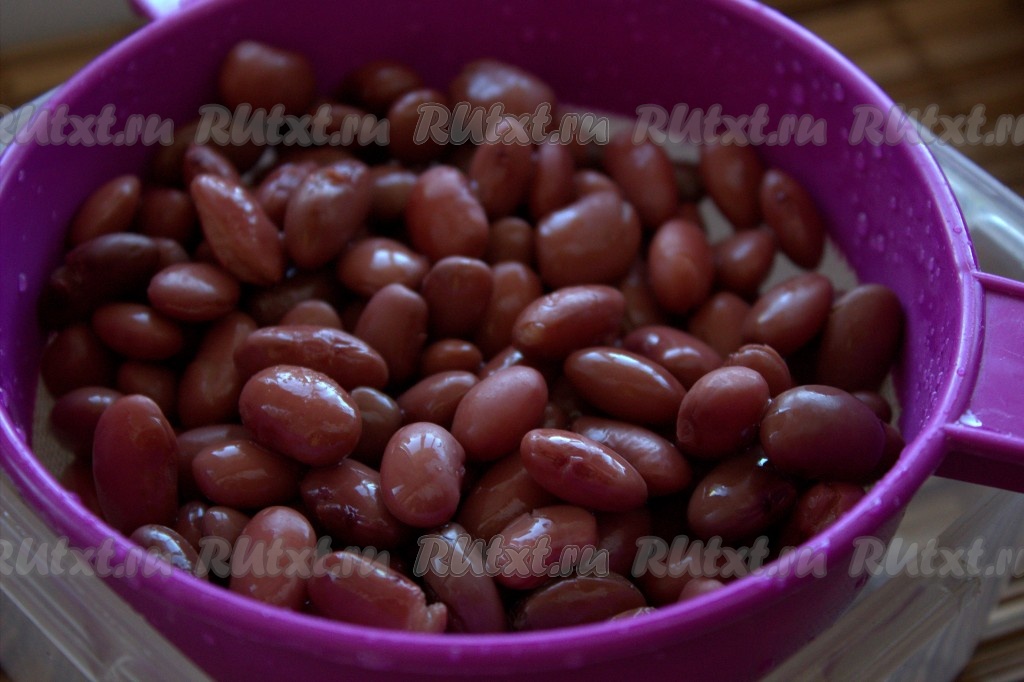 Открыть банку с фасолью, затем переложить фасоль в дуршлаг (или сито) и промыть под проточной водой, дать стечь лишней жидкости (можно выложить на бумажное полотенце и обсушить).