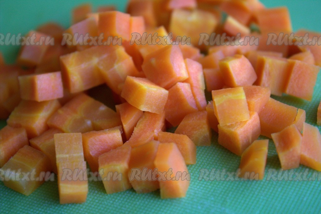 Морковку промыть, залить холодной водой так, чтобы водичка полностью покрывала морковку, отварить до готовности (обычно на варку уходит минут 30). Готовность можно проверить, проткнув её ножом, - если нож хорошо входит, значит готова. Морковь охладить, очистить и нарезать на кубики среднего размера.