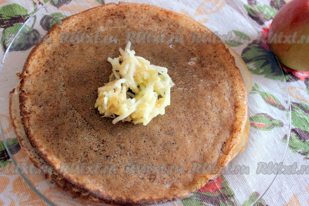 Яблоки очистить от кожуры и семечек, натереть на крупной тёрке. На корицу выложить, примерно, 1 столовую ложку с верхом натёртого яблока.