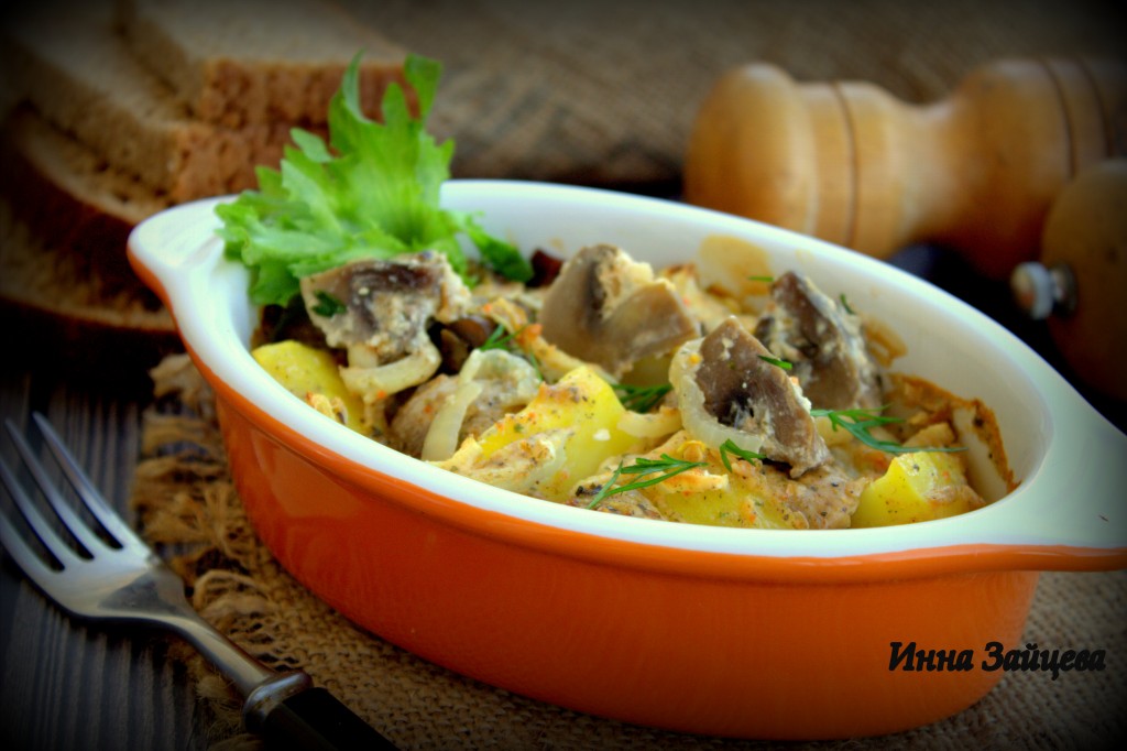Запекать картошку с шампиньонами в сметане в разогретой до 180 градусов духовке минут 40-45 (время запекания зависит от сорта картошки). Готовность картошки проверить, проткнув вилкой (если легко прокалывается, значит готова).